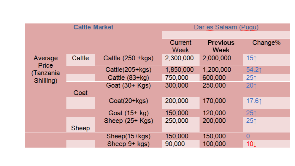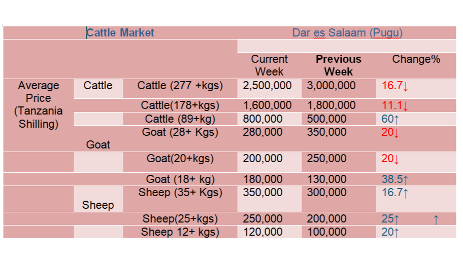 Mwenendo wa bei ya wastani ya mifugo katika mnada wa Pugu kwa wiki inayoishia tarehe 20 Agosti 2025.