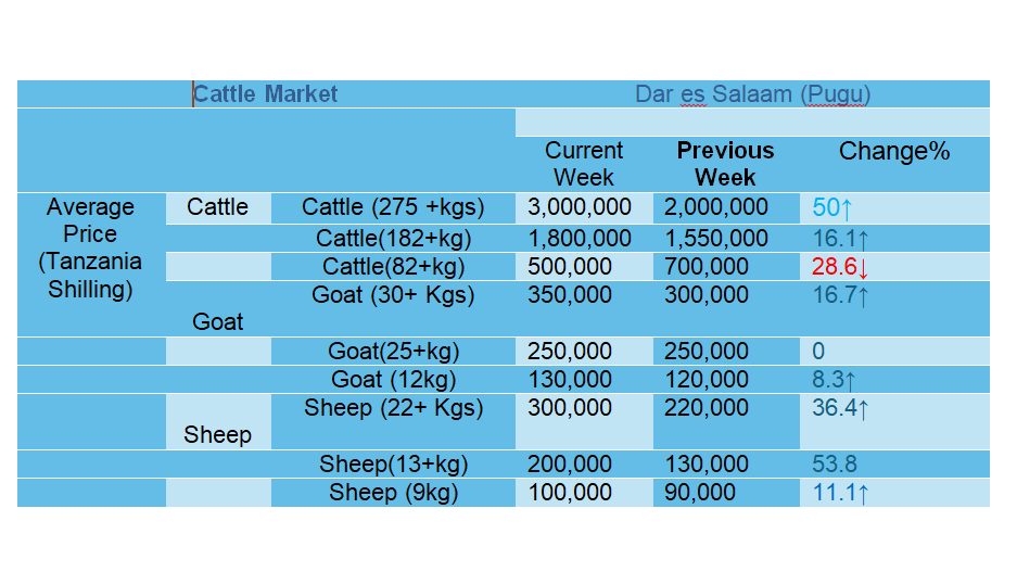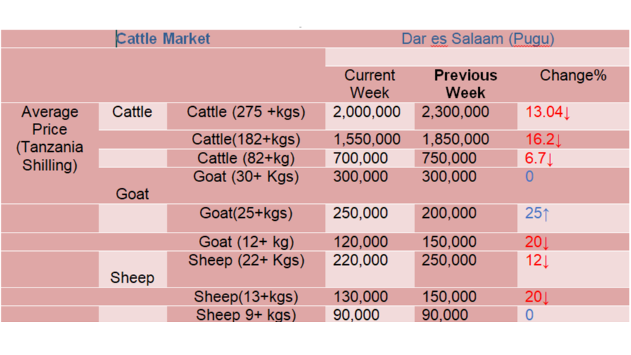 Mwenendo wa bei ya wastani ya mifugo katika mnada wa Pugu kwa wiki inayoishia tarehe 03 Septemba 2025.